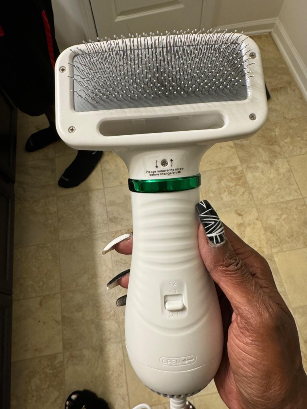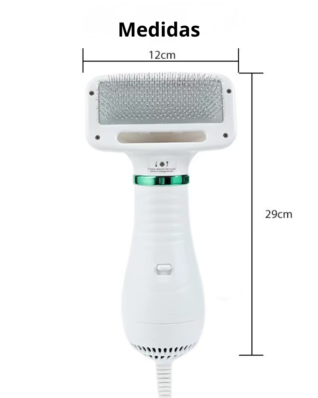 El cepillo está diseñado con púas metálicas con puntas redondeadas que no dañan la piel y un flujo de aire tibio, no caliente, ideal para perros y gatos de pelo corto, medio o largo.